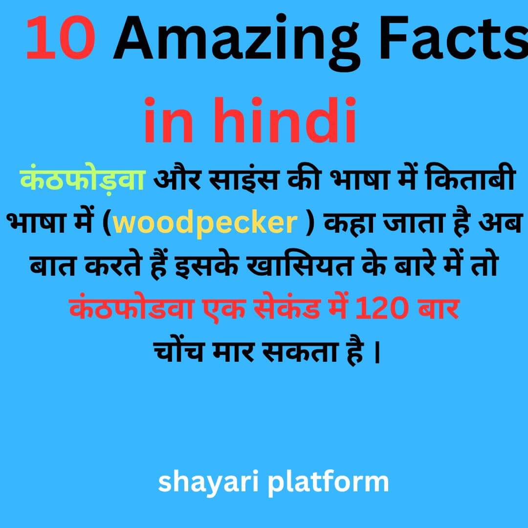 यह तीसरा फैक्ट एक पंछी से जुड़ा है जिसे आमतौर पर गांव की भाषा में कंठफोड़वा और साइंस की भाषा में किताबी भाषा में (woodpecker ) कहा जाता है अब बात करते हैं इसके खासियत के बारे में तो कंठफोडवा एक सेकंड में 120 बार चोंच मार सकता है ।