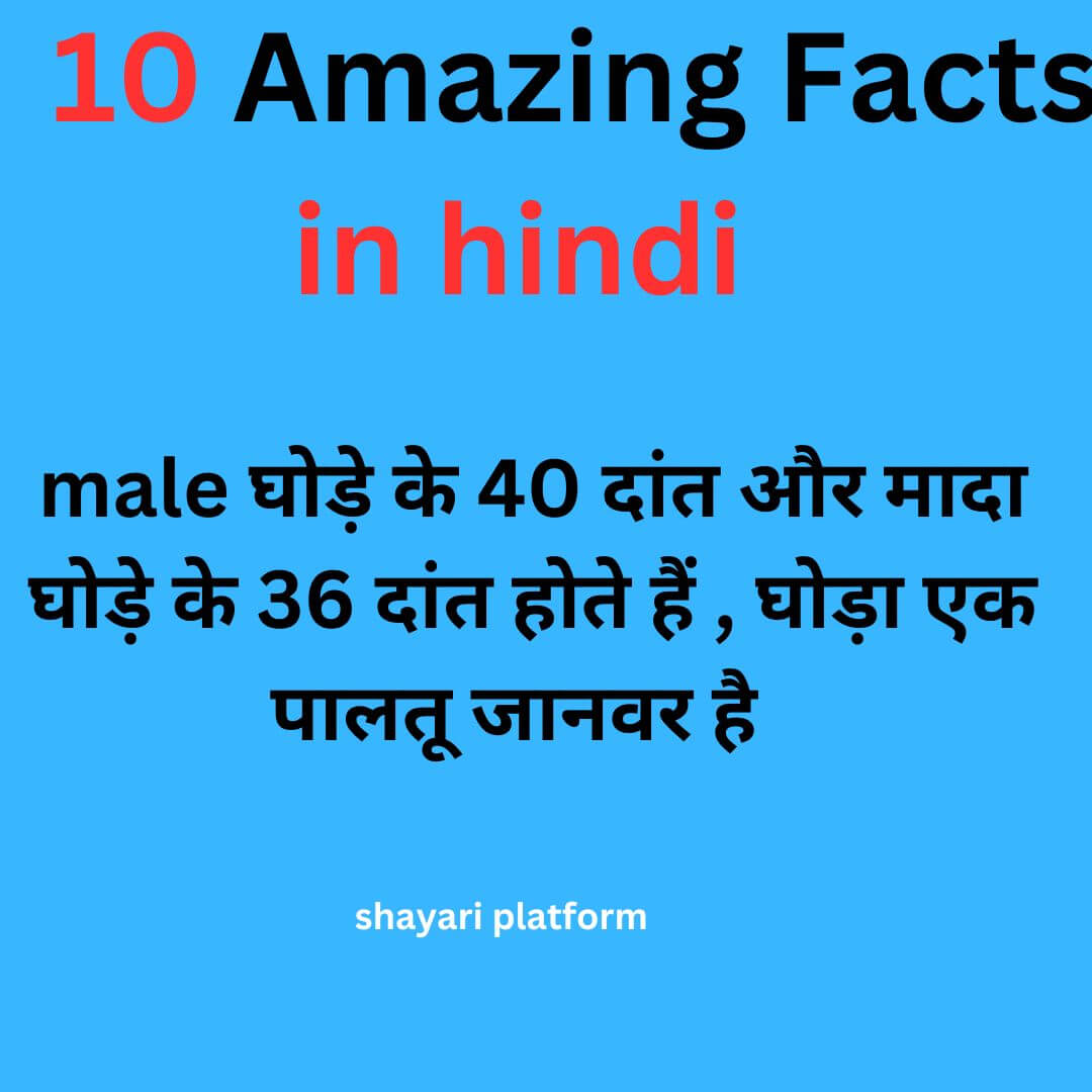यह हमारा चौथ फैक्ट घोड़े से जुड़ा है तो अब बात करते हैं घोड़े के बारे में ,male घोड़े के 40 दांत और मादा घोड़े के 36 दांत होते हैं , घोड़ा एक पालतू जानवर है जिसे सवारी के रूप में प्रयोग में लाया जाता है ।