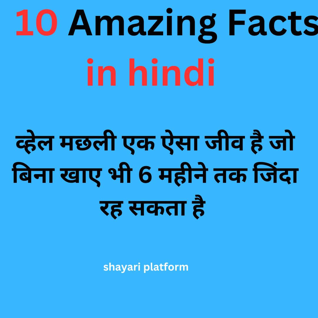 यह फैक्ट आपको जानकर बहुत ही हैरानी होगी कि व्हेल मछली एक ऐसा जीव है जो बिना खाए भी 6 महीने तक जिंदा रह सकता है सिर्फ पानी पीकर और हवा पीकर ! है ना दोस्तों अजीब बात , कोई 6 दिन जिंदा नहीं रह सकता hai और यह एक ऐसा जीव है जो 6 महीने तक बिना खाए पिए जिंदा रह सकता है ।